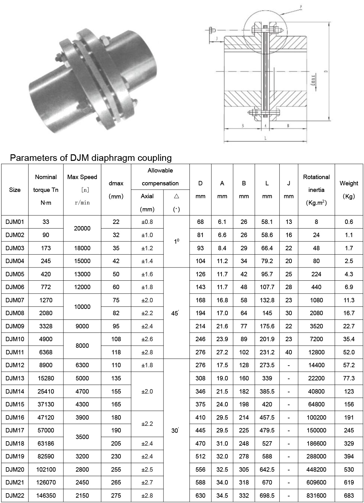 The DJM Diaphragm Coupling is an advanced, maintenance-free coupling designed for high-speed, high-torque applications requiring precise motion control and exceptional reliability. Utilizing flexible metal diaphragms instead of elastomeric elements, this coupling delivers zero-backlash performance with outstanding misalignment compensation capabilities, making it ideal for turbomachinery, marine propulsion, and precision servo systems.