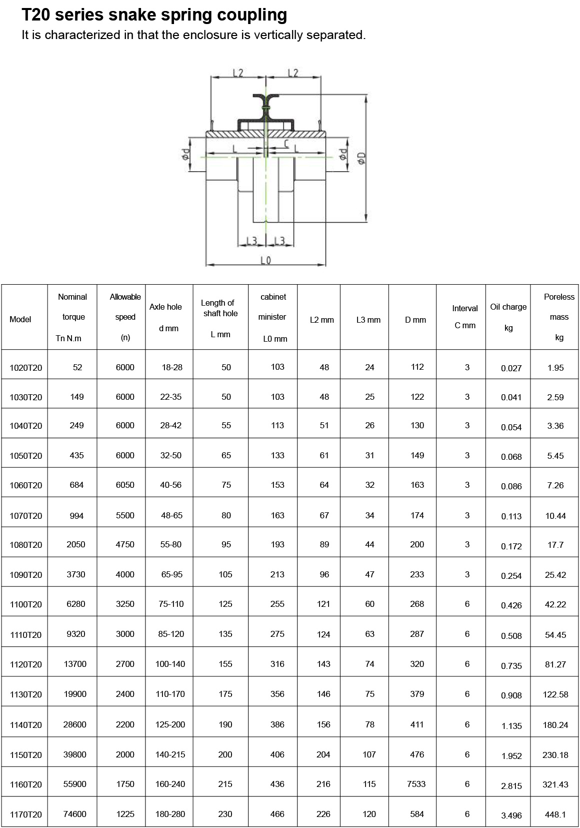 The T20 type grid coupling, also referred to as a snake spring coupling, is an advanced flexible coupling designed for high-performance power transmission applications. It is known for its compact structure, high torque capacity, and exceptional ability to absorb vibrations and mitigate impact loads.