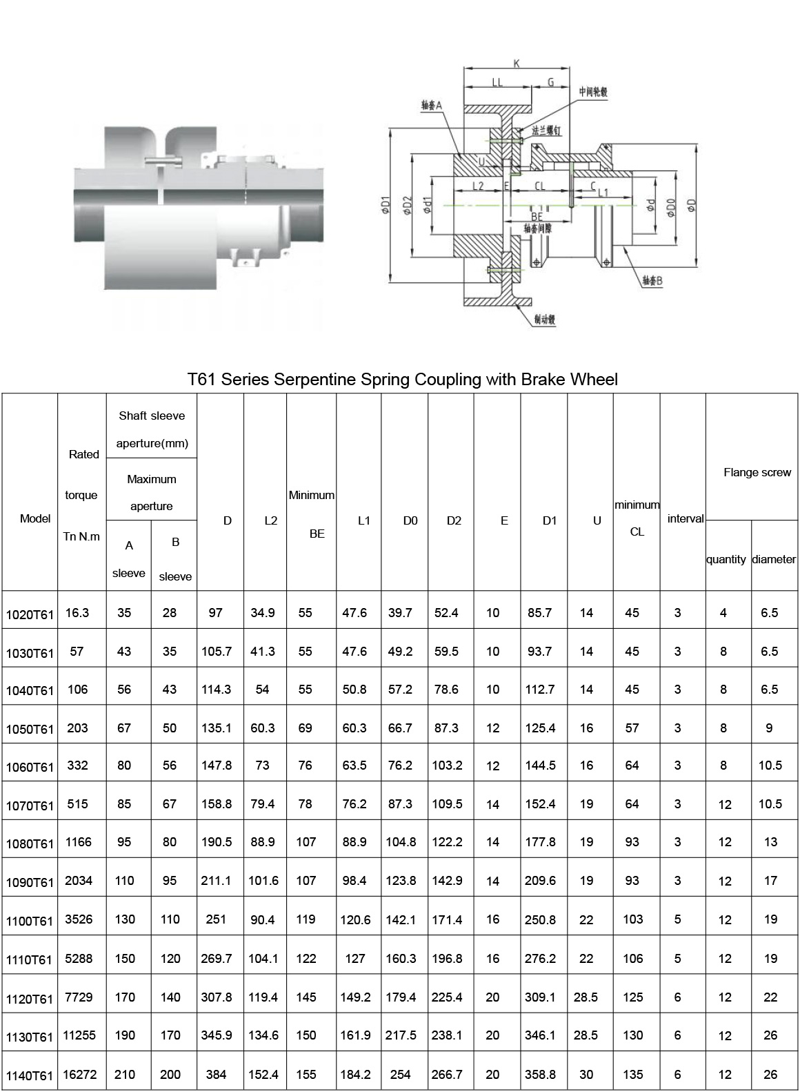 The T61 type grid coupling, commonly referred to as a snake spring coupling, is a high-performance flexible shaft coupling engineered for the reliable transmission of torque in demanding industrial applications. It is part of the grid coupling family and is specifically designed to handle high torque loads while compensating for shaft misalignments and absorbing shock and vibration.